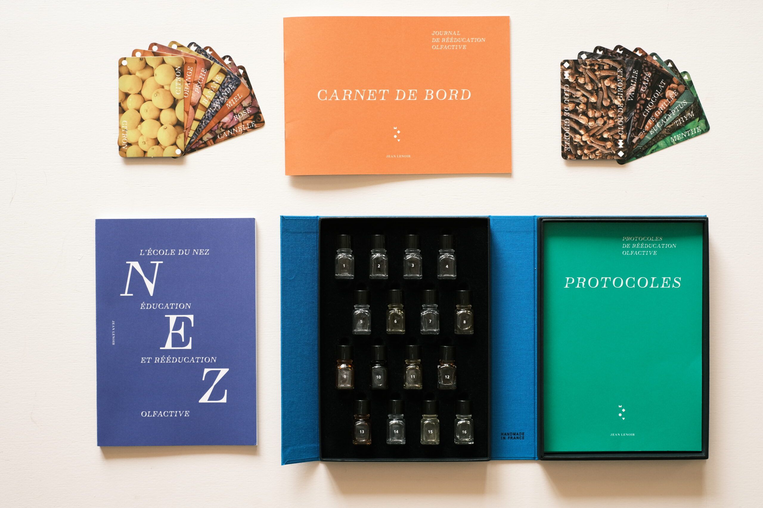 El estuche incluye un Libro Pedagógico de 96 páginas. 16 aromas calibrados para estimular el olfato. 16 tarjetas ilustradas. Libreta para anotar el progreso de los ejercicios de re-educación. Todo redactado solamente en idioma FRANCES.
